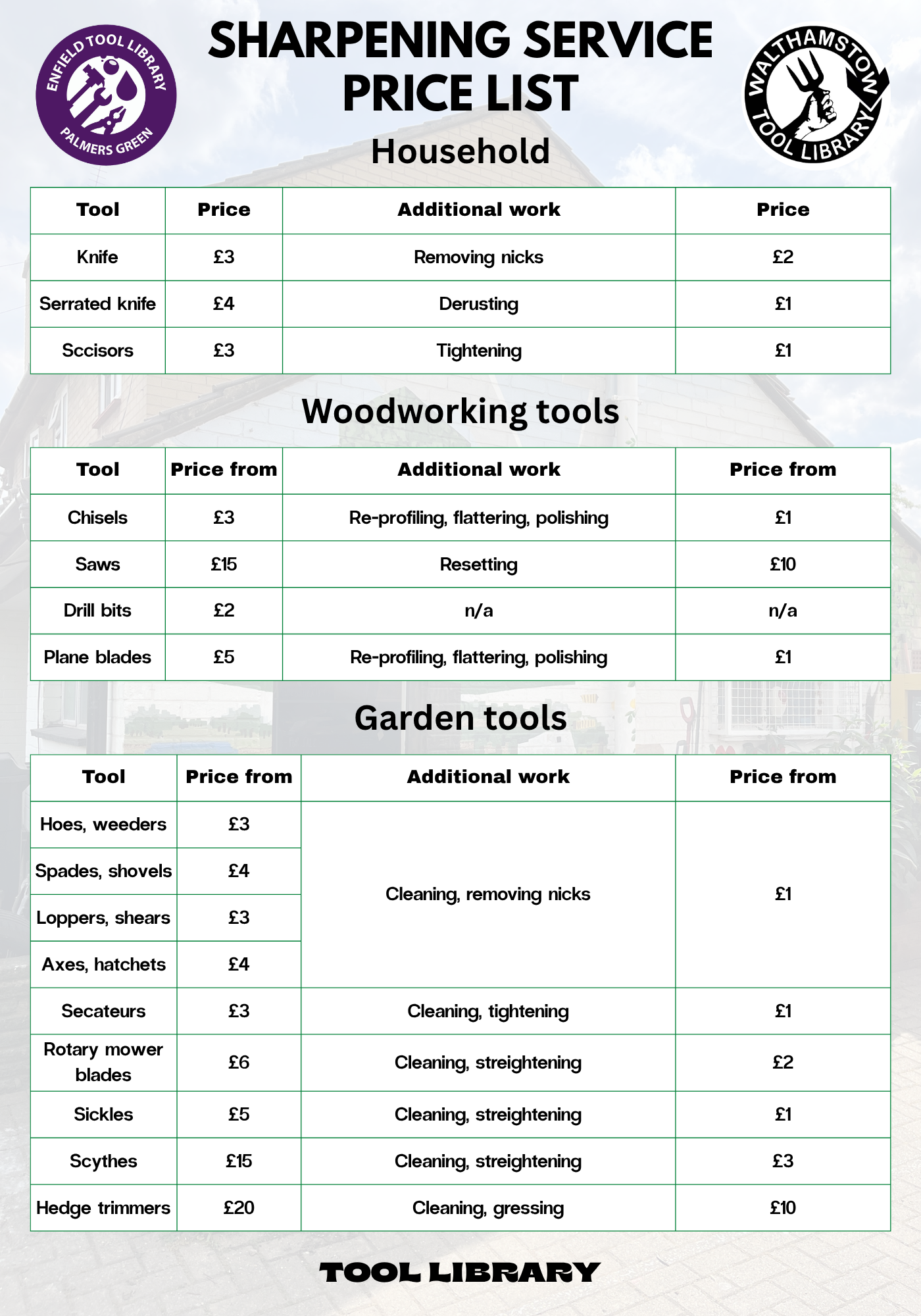 Members can book sharpening by website: Walthamstow Tool Library and Enfield Tool Library.
